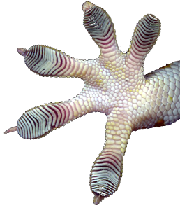 Pliegue animal Los pliegues de la pata del geko son, a un nivel microscópico, un conjunto de millones de terminaciones similares a pelos, que a su vez se ramifican en cientos de espátulas, lo que le confiere su extraordinaria adhesividad. |